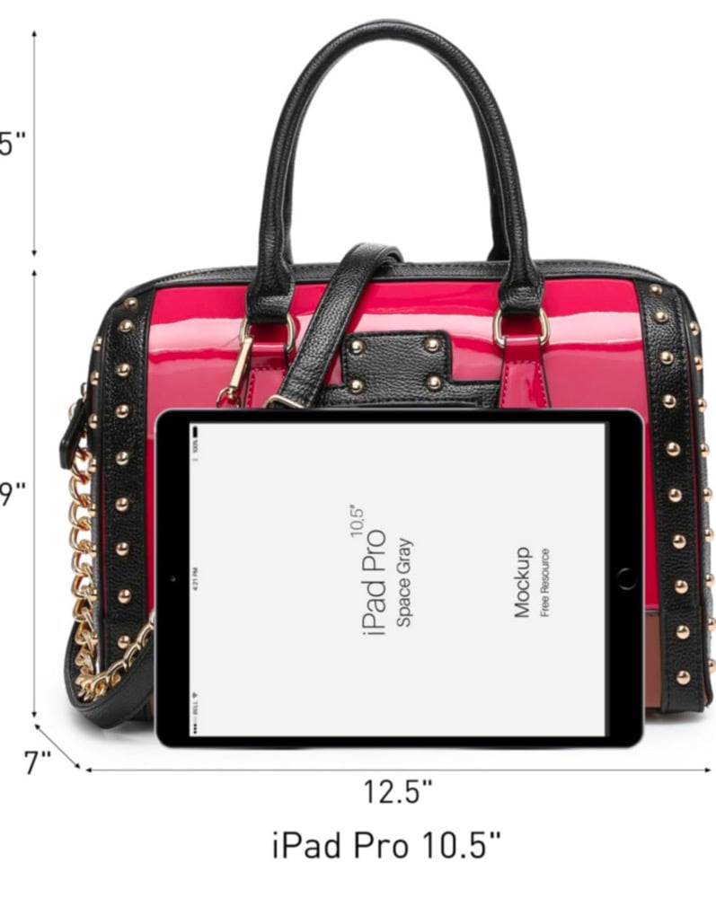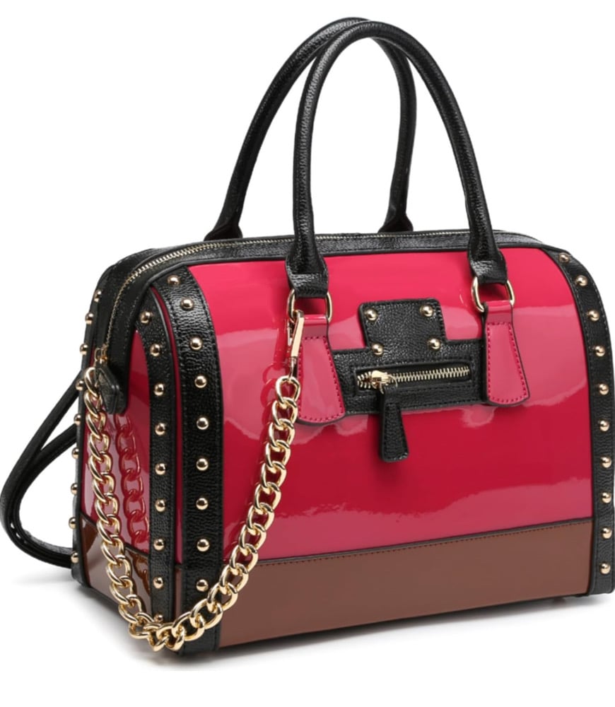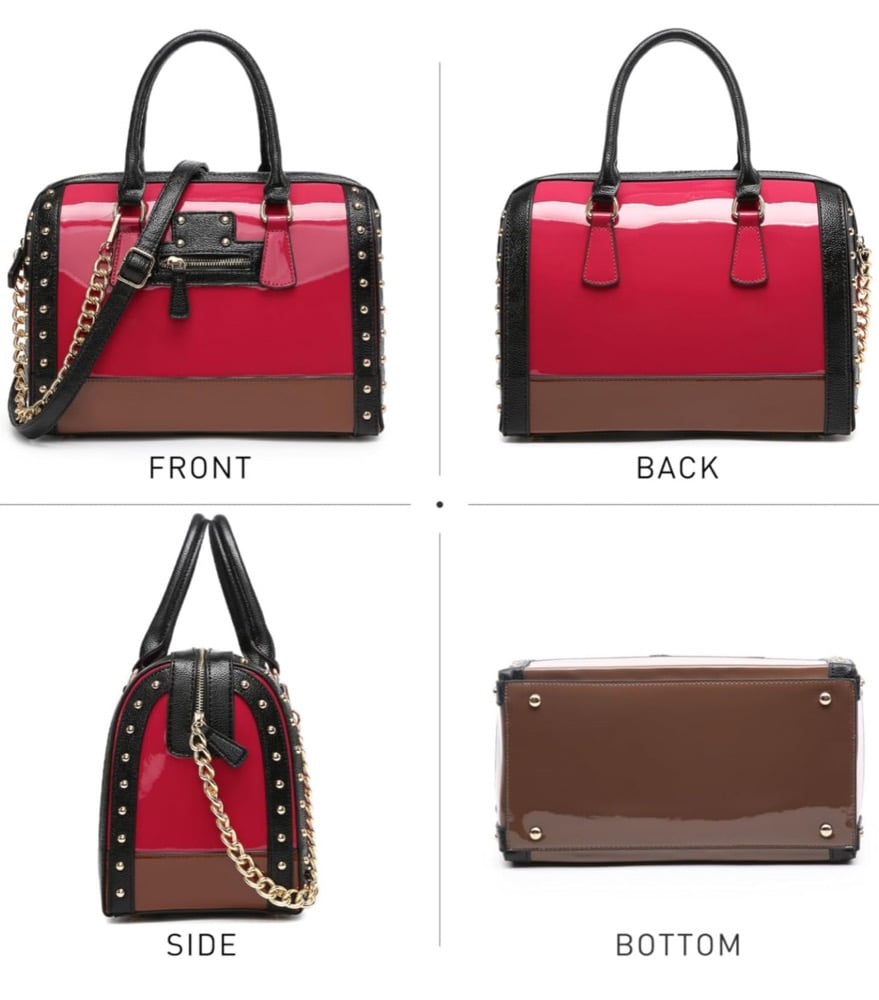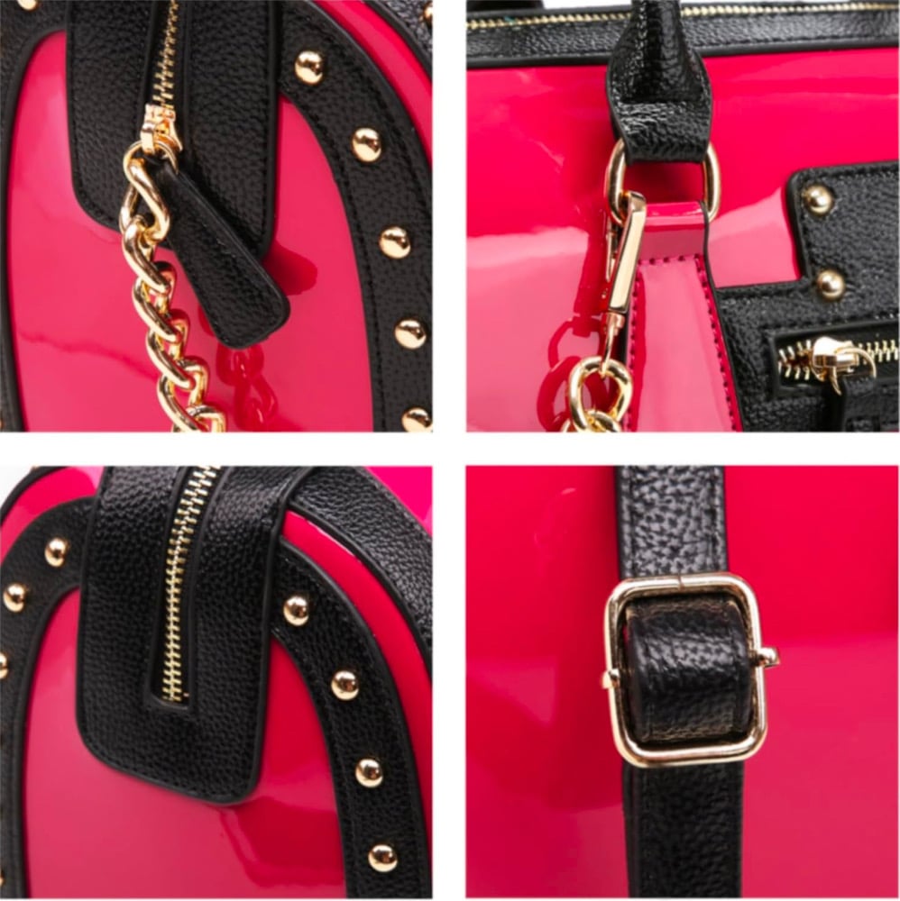 - Made of synthetic patent leather. Barrel shape means more capacity than others, decorated with rivet embellishment, practical and fashionable.